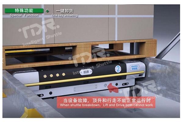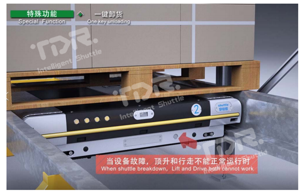 當(dāng)使用救援車(chē)救援穿梭板時(shí),如穿梭板處于重載狀態(tài),則很難將穿梭板帶貨物一起拖出,通過(guò)此功能,一鍵即可將托盤(pán)放置到軌道上,直接將穿梭板拉出即可。